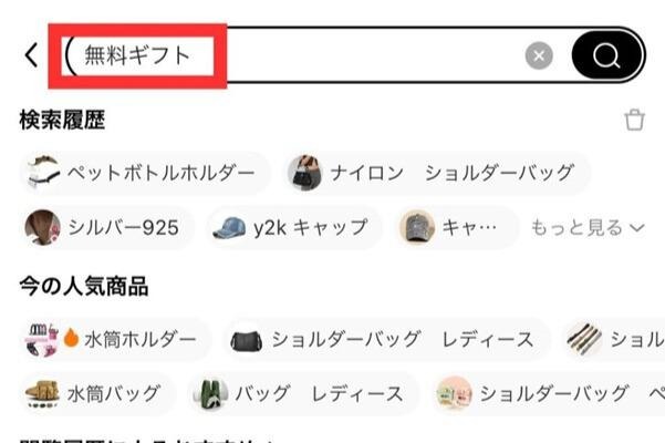 Temuの商品検索窓に「無料ギフト」と入力して検索します。